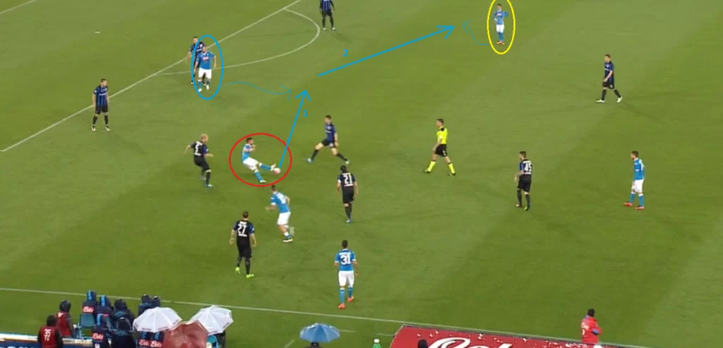 Koulibaly arriva fino a metà campo in guida palla, cercando soluzioni di passaggio. Lorenzo Insigne (cerchio azzurro) si muove tra centrocampo e difesa bergamasca, agendo quasi da trequartista. Higuian (cerchio giallo) si interessa invece di tenere schiacciata la difesa nero-azzurra, provando anche ad allungare i due reparti avversari