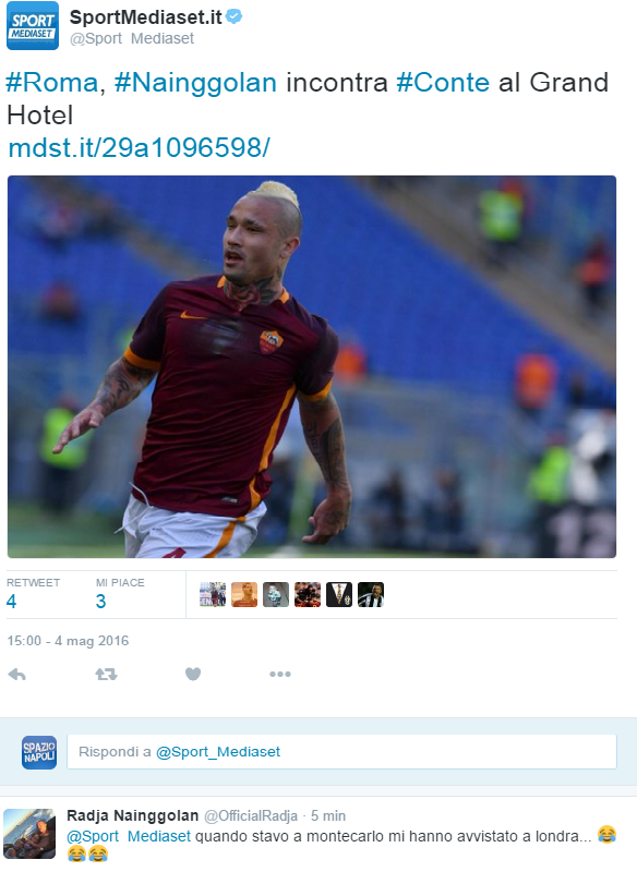Così come sostiene Marco Cherubini, esperto di mercato di Sport Mediaset, Antonio Conte pare abbia messo gli occhi anche su Nainggolan, centrocampista della Roma. Oltre a un possibile colpo in attacco, dunque, l’ex allenatore della Juventus sta lavorando per rafforzare anche il centrocampo. L’incontro tra i due – secondo Sportmediaset – sembra sia avvenuto ieri sera al Grand Hotel intorno alle 23:30.