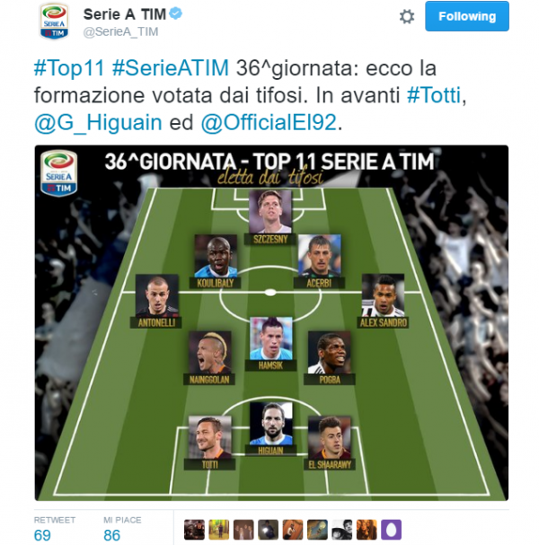 Sono tre gli azzurri scelti dalla Lega Serie A Tim per la Top 11 della trentaseiesima giornata di campionato. La formazione completa è stata pubblicata dal profilo Twitter della Lega.