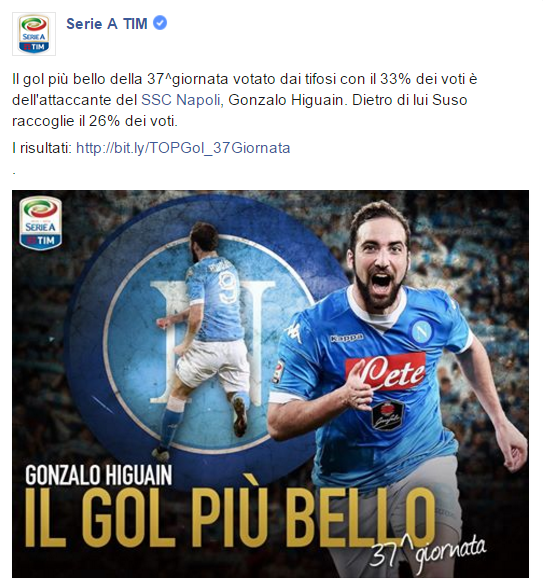 Ultim'ora sul Calcio Napoli, le news FOTO – Serie A, il gol più bello della 37esima giornata è di Higuain 11 Mag 2016 - 00:22 di redazione È di Gonzalo Higuain il gol più della 37esima giornata della Serie A. L’argentino è stato votato dal 33% dei votanti. A seguire Suso con il 26%. Ecco il post apparso sul profilo Facebook della Serie A Tim: RredazioneRedazione SpazioNapoli