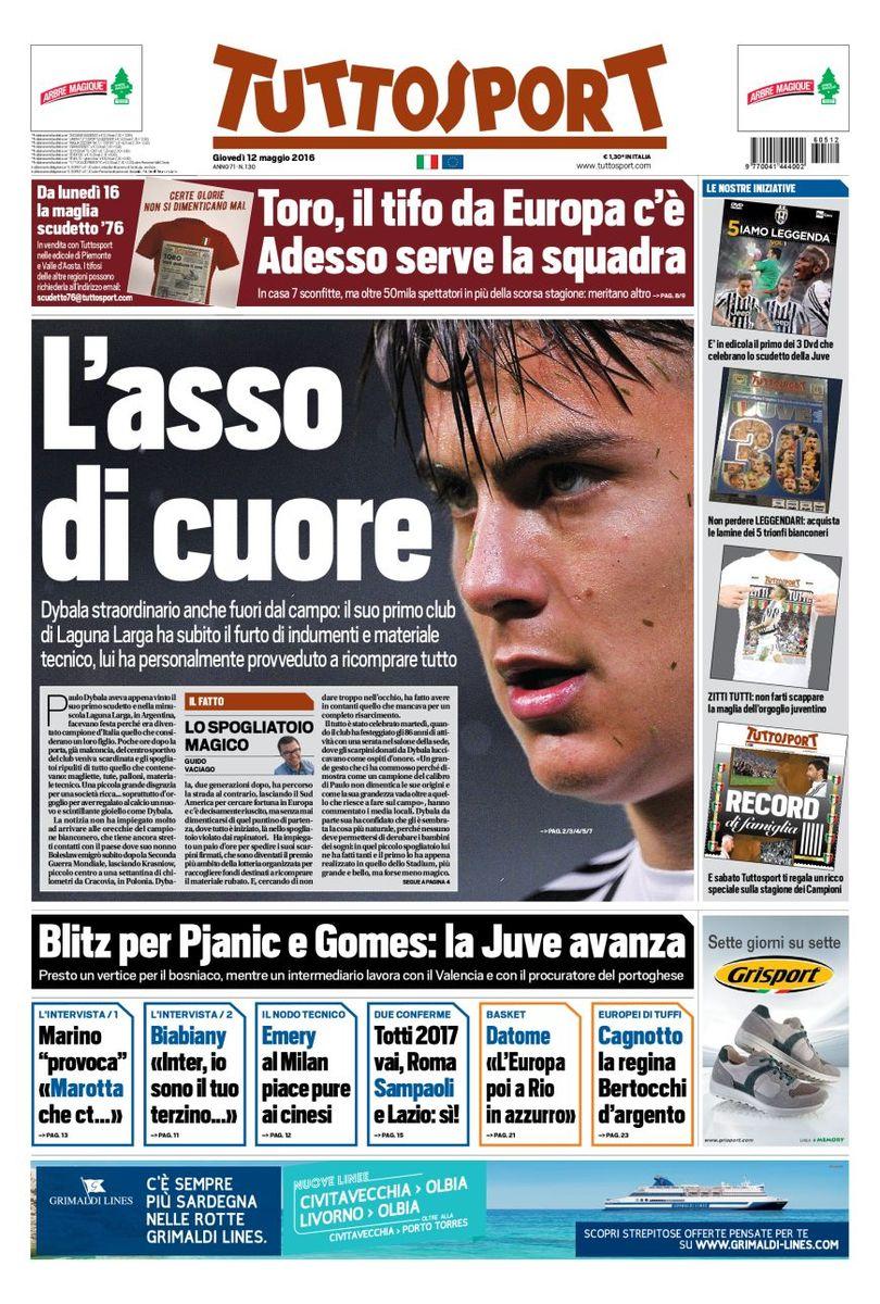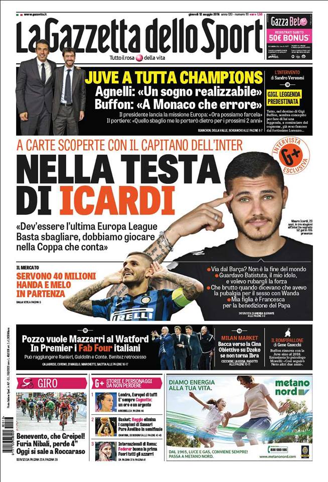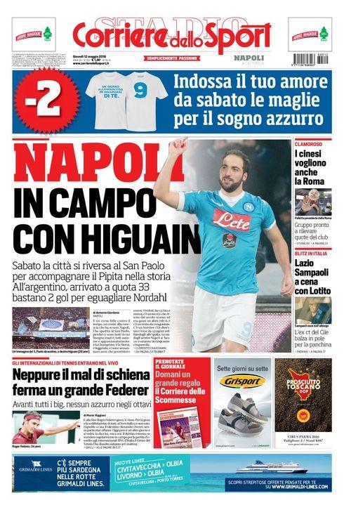 La prima pagina odierna del Corriere dello Sport si concentra in particolar modo su Gonzalo Higuain e sulla spinta che sabato sera gli darà il pubblico contro il Frosinone per raggiungere, e magari superare, il record di 35 reti in un unico campionato di Nordahl. La Gazzetta dello Sport, invece, non dedica spazio in apertura al Napoli ma evidenzia l’interessa del Watford per l’ex allenatore azzurro Walter Mazzarri.