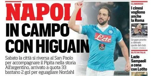 La prima pagina odierna del Corriere dello Sport si concentra in particolar modo su Gonzalo Higuain e sulla spinta che sabato sera gli darà il pubblico contro il Frosinone per raggiungere, e magari superare, il record di 35 reti in un unico campionato di Nordahl. La Gazzetta dello Sport, invece, non dedica spazio in apertura al Napoli ma evidenzia l’interessa del Watford per l’ex allenatore azzurro Walter Mazzarri.