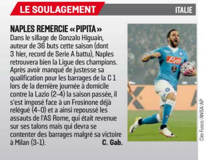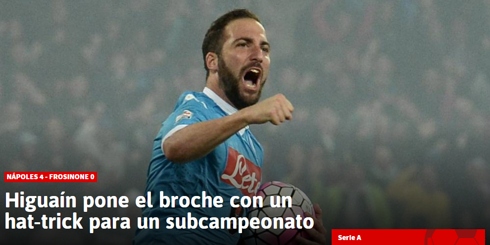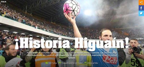 Ha avuto un enorme risalto mediatico, come prevedibile, l’hat-trick di Gonzalo Higuain con il Frosinone, che ha permesso al Pipita di scrivere una pagina importantissima nella storia del calcio italiano. Il delantero azzurro è stato celebrato in Spagna, in Argentina, in Francia e in Inghilterra in questo modo.