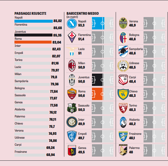 A campionato ormai terminato, non resta altro che analizzare i dati delle varie squadre che si sono date battaglia in questa lunga ed emozionante cavalcata. I numeri non mentono mai, direbbero i più pignoli, eppure a dominare le statistiche non c’è l’insaziabile Juve di Allegri ma il sorprendente Napoli di Sarri. Secondo quanto riportato dall’edizione odierna de La Gazzetta dello sport gli azzurri hanno dei numeri straordinari: “ Gli azzurri hanno avuto il baricentro più alto del campionato (53,3 metri), maggior possesso palla (62,85% di media), con la miglior percentuale di passaggi riusciti (85,82%), che includono il miglior passatore del campionato: Jorginho ha chiuso con la mostruosa cifra di 3.590 appoggi, con i compagni Hamsik3.013) e Albiol (2.574) a seguire”.