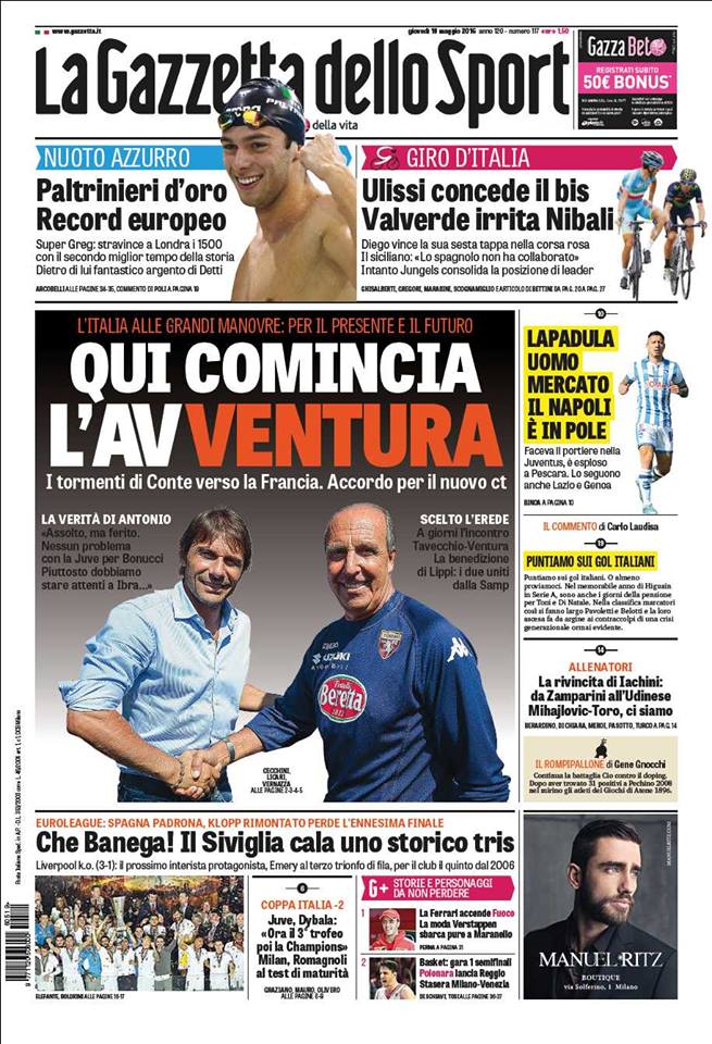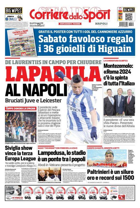 Le prime pagine dei quotidiani sportivi nazionali mettono in evidenza il mercato del Napoli concentrandosi in particolar modo sulla trattativa tra azzurri e Pescara per Gianluca Lapadula. Il Corriere dello Sport spiega come sia addirittura sceso in campo il presidente De Laurentiis per assicurarsi il gioiello italo-peruviano. La Gazzetta dello Sport, invece, non dà ancora per concluso l’affare mettendo in risalto le squadre che ancora concorrono per l’attaccante; Napoli su tutte e alle sue spalle Juventus, Lazio e Genoa.