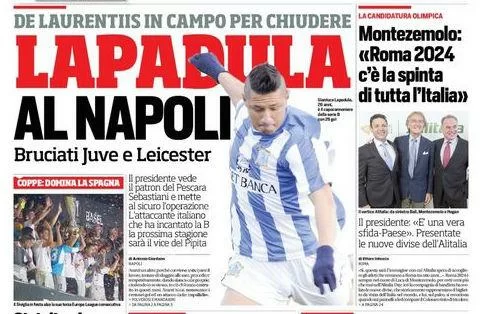 Le prime pagine dei quotidiani sportivi nazionali mettono in evidenza il mercato del Napoli concentrandosi in particolar modo sulla trattativa tra azzurri e Pescara per Gianluca Lapadula. Il Corriere dello Sport spiega come sia addirittura sceso in campo il presidente De Laurentiis per assicurarsi il gioiello italo-peruviano. La Gazzetta dello Sport, invece, non dà ancora per concluso l’affare mettendo in risalto le squadre che ancora concorrono per l’attaccante; Napoli su tutte e alle sue spalle Juventus, Lazio e Genoa.