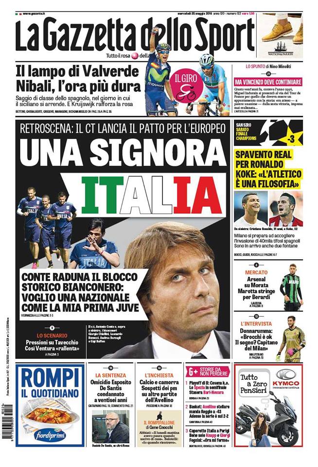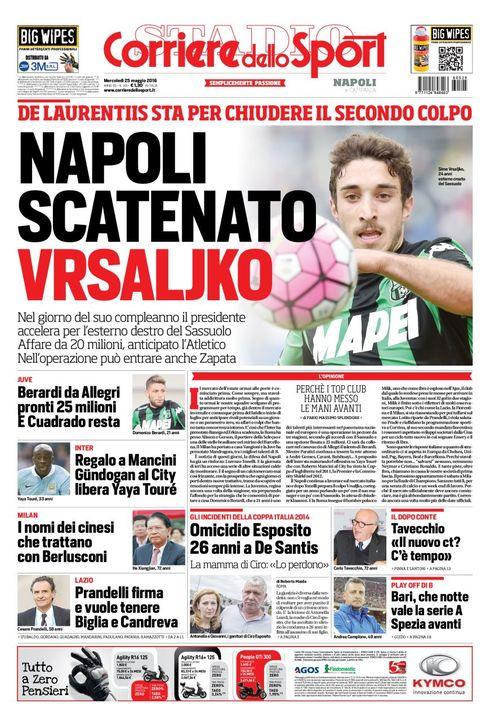 Le prime pagine dei quotidiani sportivi nazionali danno molta attenzione alla sentenza giuridica ai danni di Daniele De Santis, condannato a 26 anni di reclusione per l’omicidio di Ciro Esposito. Sul fronte mercato, invece, Il Corriere dello Sport mette in grande risalto quello che potrebbe essere il secondo colpo messo a segno dal Napoli; ovvero l’acquisto del terzino destro del Sassuolo Sime Vrsaljko.