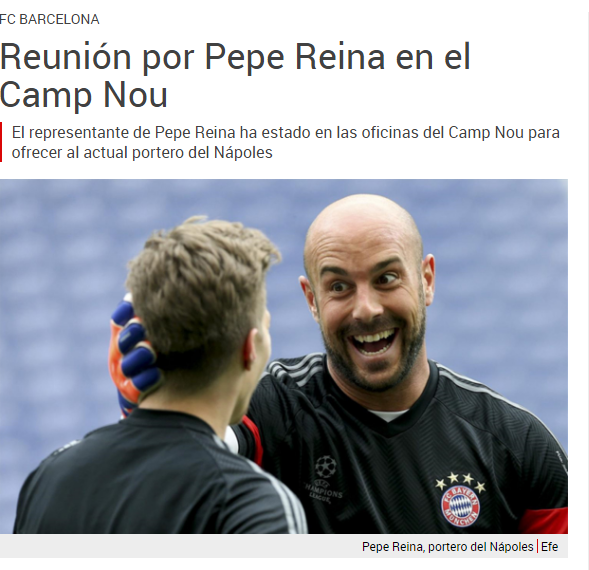 Secondo quanto riporta Sport.es, il rappresentante di Pepe Reina, Manuel Garcia Quilon, avvistato negli uffici del Camp Nou, avrebbe offerto il portiere spagnolo al Barcellona.