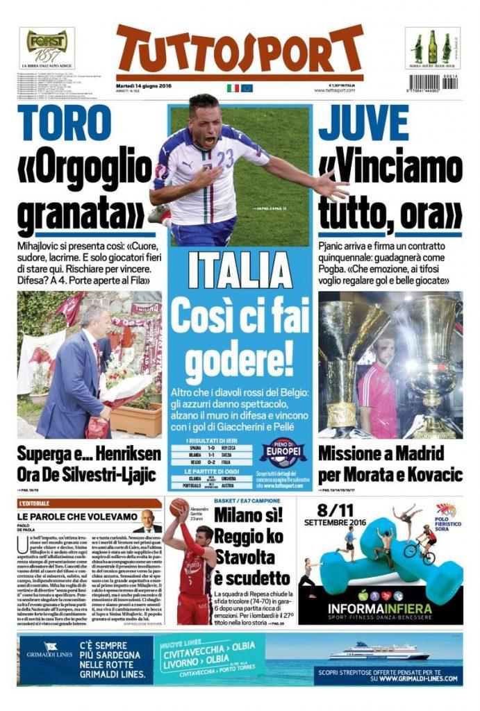 Le prime pagine dei quotidiani sportivi odierni mettono in risalto la grande prestazione dell’Italia all’esordio ad Euro2016 contro il Belgio sconfitto per due reti a zero dalle reti di Giacchirini e Pellè. Il Corriere dello Sport evidenzia anche il mercato del Napoli che, sfumato ormai Zielinski diretto a Liverpool, è intenzionato a chiudere per Hector Herrera per poi lanciarsi sul giovane centrocampista del Lione Tolisso; un attenzione particolare, da parte del quotidiano, anche sulla proposta del presidente De Laurentiis di avere Diego Armando Maradona come ambasciatore della società.