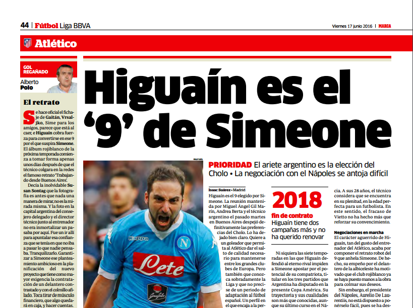 Diego Simeone ha scelto il centravanti per il suo Atletico: è Gonzalo Higuain. Il nome è emerso ed è stato suggerito dal tecnico dei colchoneros durante la riunione con Miguel Angel Gil Marin e Andrea Berta. Higuain piace molto sia per la conoscenza del campionato spagnolo (ha giocato con il Real Madrid prima di vestire la maglia azzurra), sia per la sua esperienza e per lo straordinario campionato disputato.