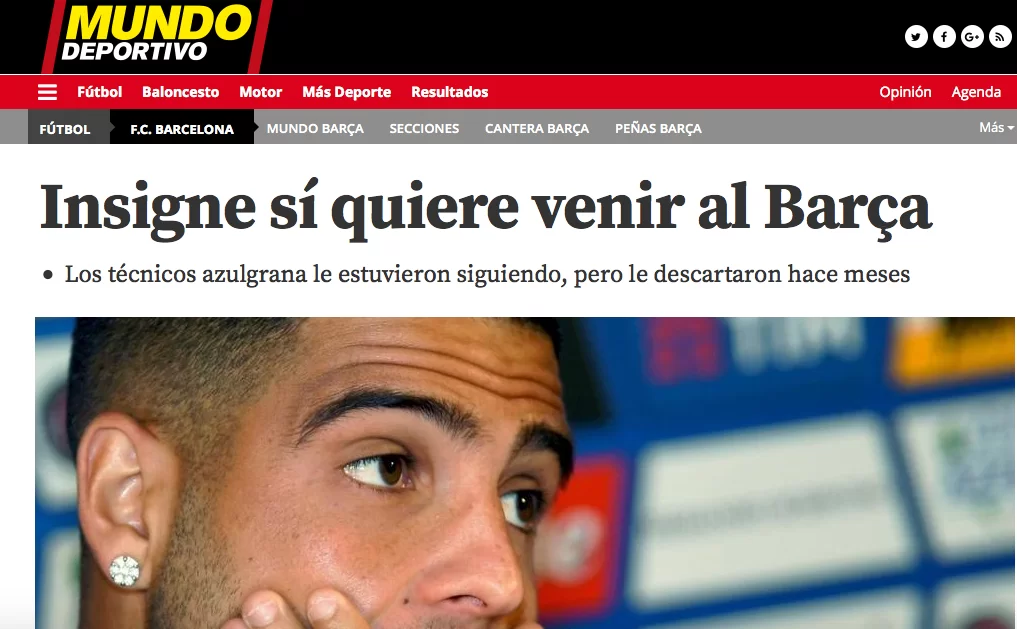 Secondo quanto riportato da Mundo Deportivo, sarebbero stati però gli agenti del calciatore ad aver messo in giro, ultimamente, le voci di un interesse concreto e reale del Barcellona per Insigne, che il Napoli venderebbe per 25 milioni di euro.