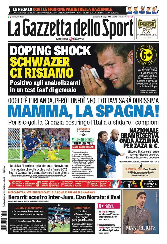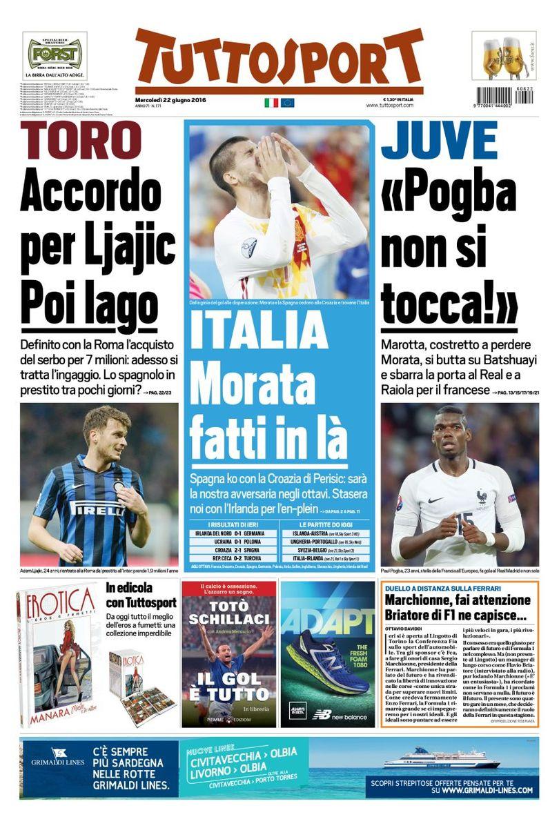 Le prime pagine dei quotidiani sportivi odierni si dedicano principalmente alla Nazionale Italiana che, dopo la sconfitta della Spagna contro la Croazia per 2-1, ha ufficialmente pescato agli ottavi di finale di Euro 2016 proprio le Furie Rosse in un remake della finale persa dagli azzurri nell’Europeo del 2012. Il Corriere dello Sport riporta di una svolta nell’affare tra Napoli e Lione per Tolisso; offerta di 18 milioni di euro con la possibilità di salire. Ci sarebbero invece difficoltà di prezzo nella trattativa con il Monaco per l’esterno destro Fabinho.