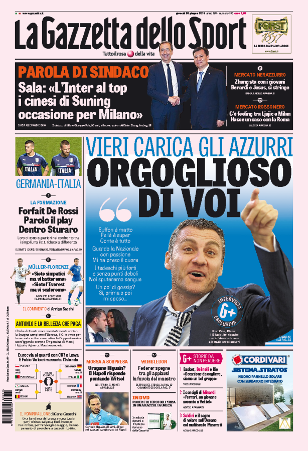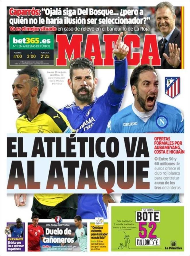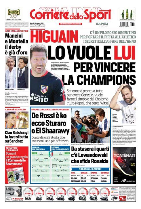 Le prime pagine dei quotidiani sportivi odierni si concentrano principalmente sulla questione riguardante Gonzalo Higuain che, dopo le parole di suo fratello-agente, è diventato il pezzo pregiato di questo mercato. Il Corriere dello Sport riporta della grandissima volontà di Simeone di portare il Pipita a Madrid per farne il simbolo del Cholismo e per conquistare finalmente la Champions League. Anche il quotidiano spagnolo Marca evidenzia l’interessamento dell’Atletico per l’attaccante argentino che, però, è in staffetta con altri due grandi bomber; ovvero Aubameyang e Diego Costa.