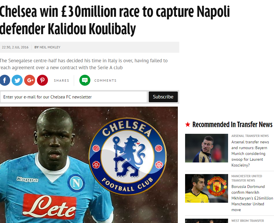 Dall’Inghilterra sono sicuri: Kalidou Koulibaly andrà al Chelsea. Nonostante le parole di qualche settimana fa di De Laurentiis (“Rimarrà con noi per altri tre anni”), il Mirror ha lanciato la notizia di un affare concluso dal club britannico per accaparrarsi il centrale franco-senegalese. Il difensore ha deciso che lascerà l’Italia, essedo falliti i tentativi di rinnovo del contratto con la società partenopea.