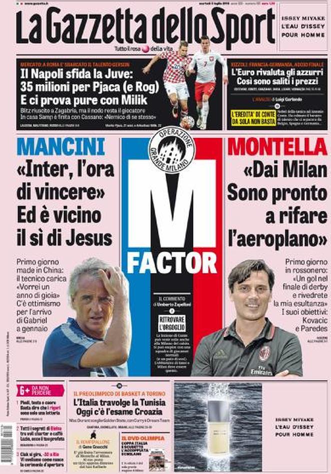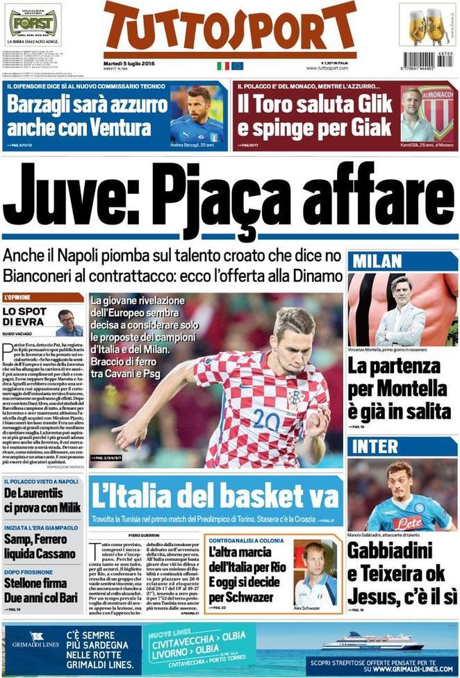 Le prime pagine dei quotidiani sportivi odierni pongono l’attenzione sul mercato che pian piano entra nel vivo, in particolare quello del Napoli. Il Corriere dello Sport apre con la trattativa che ha acceso la giornata di ieri; ovvero quella di Milik presente in territorio partenopeo. Il giocatore sta trattando con la società, mentre l’Ajax accetterebbe un’offerta intorno ai 15 milioni. La Gazzetta dello Sport, invece, oltre che sull’attaccante polacco, si concentra sul duello tra azzurri e Juventus per i due talenti della Dinamo Zagabria Pjaca e Rog; 35 milioni l’offerta del Napoli, ma il primo preferirebbe i bianconeri. Tuttosport evidenzia il ritorno di fiamma dell’Inter per Manolo Gabbiadini.