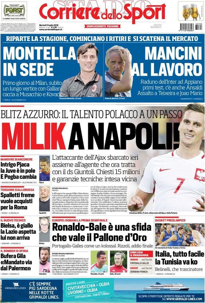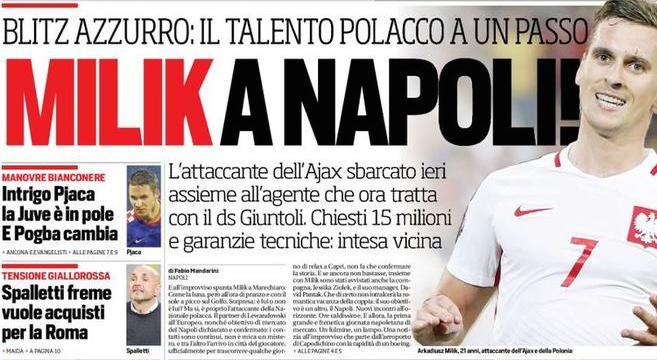 Le prime pagine dei quotidiani sportivi odierni pongono l’attenzione sul mercato che pian piano entra nel vivo, in particolare quello del Napoli. Il Corriere dello Sport apre con la trattativa che ha acceso la giornata di ieri; ovvero quella di Milik presente in territorio partenopeo. Il giocatore sta trattando con la società, mentre l’Ajax accetterebbe un’offerta intorno ai 15 milioni. La Gazzetta dello Sport, invece, oltre che sull’attaccante polacco, si concentra sul duello tra azzurri e Juventus per i due talenti della Dinamo Zagabria Pjaca e Rog; 35 milioni l’offerta del Napoli, ma il primo preferirebbe i bianconeri. Tuttosport evidenzia il ritorno di fiamma dell’Inter per Manolo Gabbiadini.