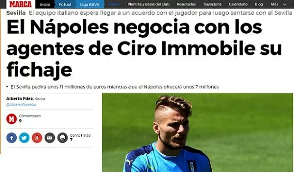 Nelle settimane scorse si era sparsa la voce di un possibile interessamento del Napoli per Ciro Immobile, notizia poi smentita dal presidente De Laurentiis. Ebbene oggi questa voce si fa nuovamente forte. Infatti, come riporta l’edizione online di Marca, il Napoli si starebbe muovendo per acquistare l’attaccante del Siviglia. Oggi – raccontano dalla Spagna – i partenopei dovrebbero incontrare gli agenti dell’attaccante e iniziare a trovare un’intesa per l’ingaggio. La strategia del club azzurro infatti pare sia quella di trovare prima l’accordo con il giocatore e poi affondare il colpo con il Siviglia.