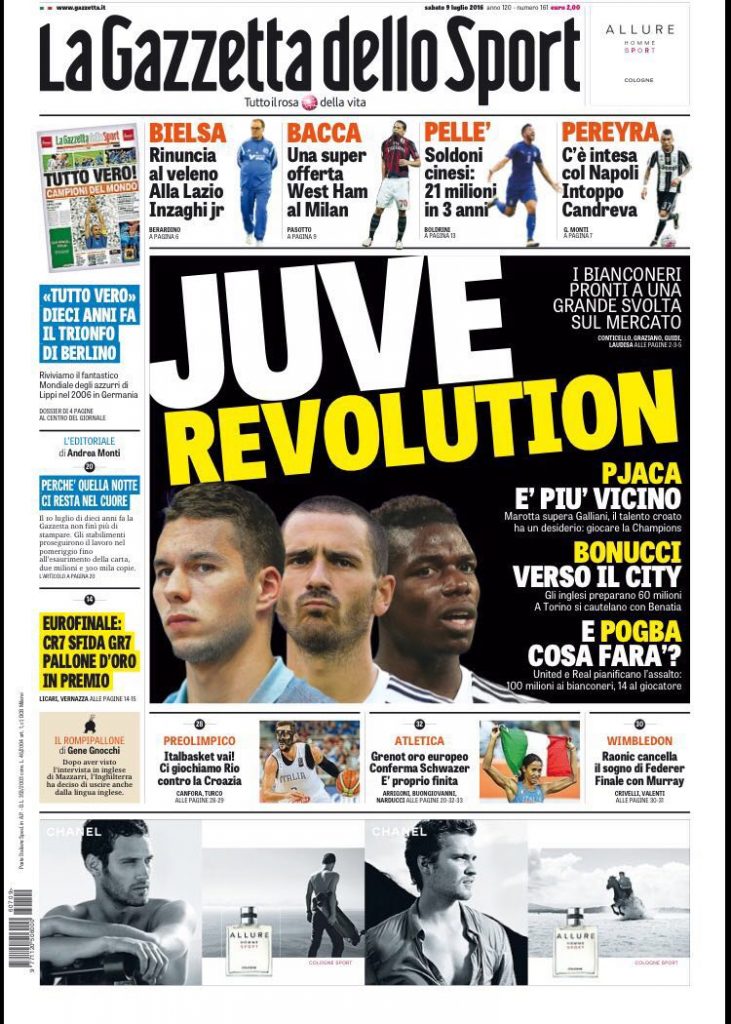 La Gazzetta dello Sport si concentra sulla trattativa Napoli-Juve per Roberto Pereyra e parla di una rivoluzione Juve, con le trattative concernenti Pjaca, Pogba e Bonucci.