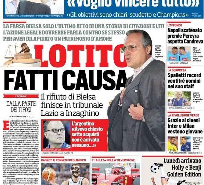 Il Corriere dello Sport analizza in primo piano la questione Bielsa, con il presidente Lotito pronto ad adire le vie legali, mentre a lato analizza il mercato azzurro, con Pereyra e Candreva in arrivo.