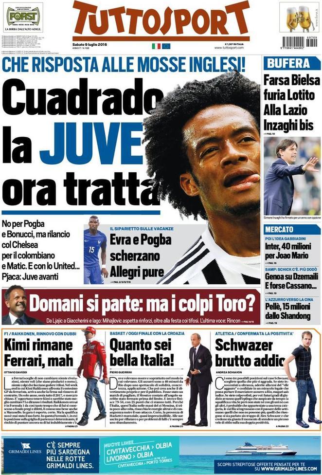Sono online le prime pagine dei principali quotidiani sportivi di sabato 9 luglio 2016. L’edizione di Tuttosport si concentra principalmente sulla trattativa per Juan Cuadrado, con il giocatore che potrebbe ritornare a Torino dopo l’esperienza della passata stagione; a lato invece si parla del caos Bielsa, con la Lazio che è tornata nelle mani di Simone Inzaghi.