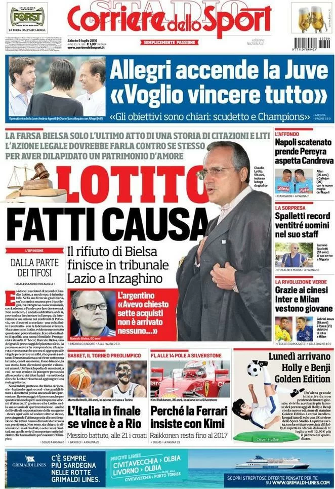 Sono online le prime pagine dei principali quotidiani sportivi di sabato 9 luglio 2016. L’edizione di Tuttosport si concentra principalmente sulla trattativa per Juan Cuadrado, con il giocatore che potrebbe ritornare a Torino dopo l’esperienza della passata stagione; a lato invece si parla del caos Bielsa, con la Lazio che è tornata nelle mani di Simone Inzaghi.