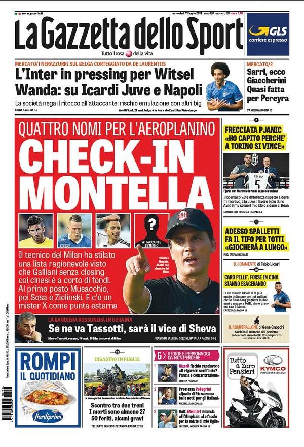 C’è molto azzurro nelle prime pagine delle maggiori testate sportive italiane. Ne La Gazzetta dello Sport, ad esempio, si parla di Witsel, uno dei nomi che sta affollando principalmente il mercato del Napoli, su cui si starebbe concentrando anche l’Inter di Mancini; Tuttosport, invece, focalizza l’attenzione su Higuain e su presunte voci di corridoio che vorrebbero vederlo in maglia bianconera: fra questi c’è anche Pjanic, ex Roma, che disputerà la prossima stagione proprio fra le schiere di Allegri; si parla del Pipita anche su Il Corriere dello Sport, che cita anche il secondo (ormai ufficiale) acquisto del Napoli, Emanuele Giaccherini, che ha da poco terminato l’avventura con la Nazionale di Conte ed è pronto a cominciarne un’altra… sempre in azzurro. E viene anche menzionato l’interesse per un altro ex juventino, Pereyra, per cui Giuntoli e società si stanno muovendo.