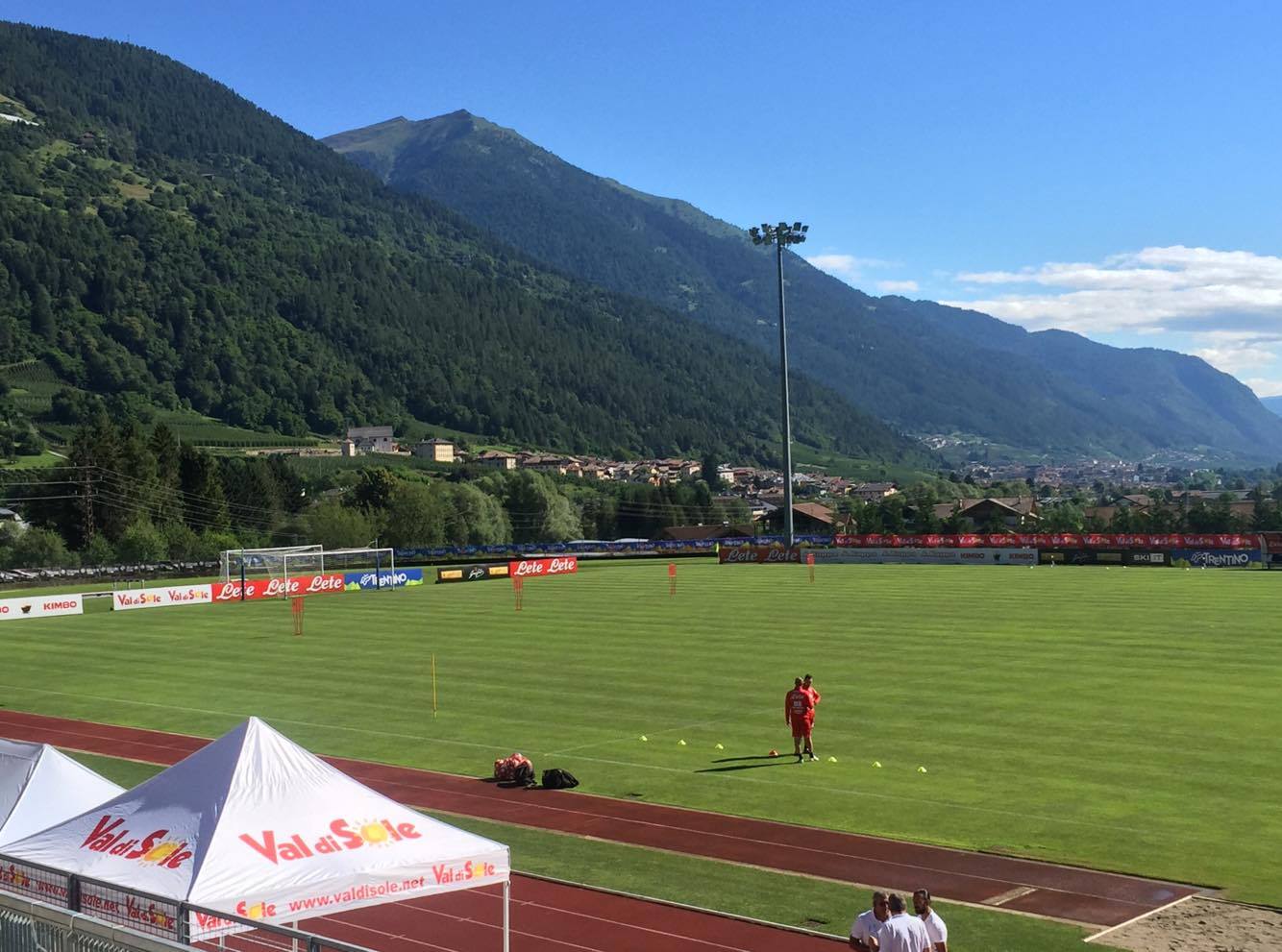 Su Dimaro splende un bellissimo sole e la temperatura è leggermente aumentata rispetto a quella degli ultimi giorni: 15°, cielo sereno e sole dominante la valle. Il centro sportivo di Dimaro viene riempito in ogni ordine di posto da moltissimi tifosi azzurri, giunti in Trentino per far sentire il proprio calore alla squadra.