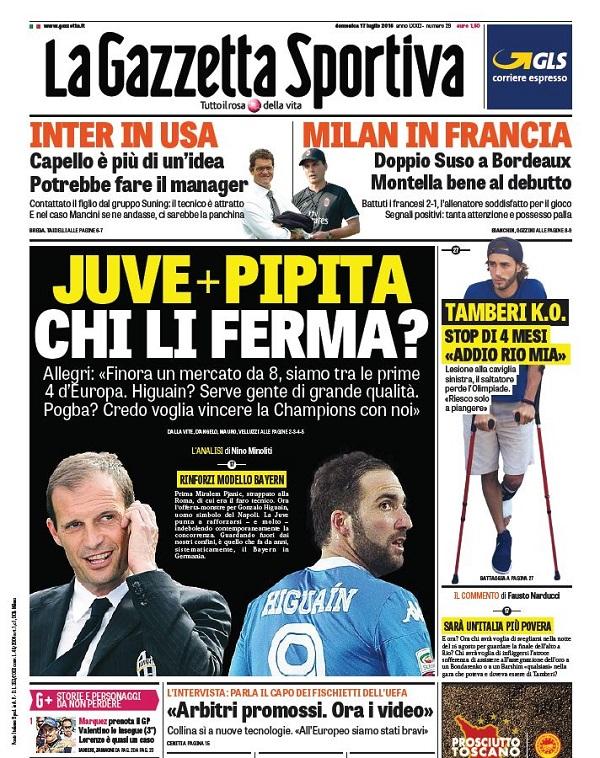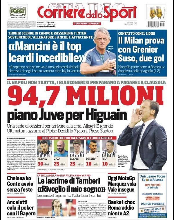 Anche il Corriere dello Sport riprende il costo della clausola del Pipita insieme alle strategie dei bianconeri per acquistarlo. Inoltre, le parole di Mancini ed il mercato del Milan.
