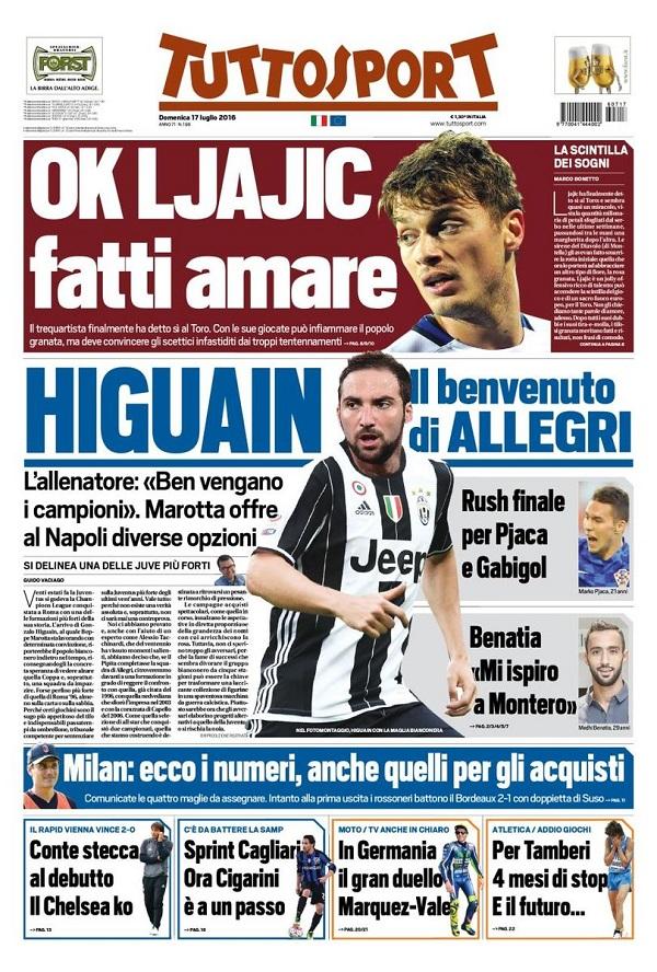 Grande entusiasmo per il presunto arrivo di Higuain anche per il quotidiano di Torino Tuttosport. Le belle parole di Allegri per l’argentino, insieme alla trattativa ormai in fase conclusiva per Toro per Ljajic.