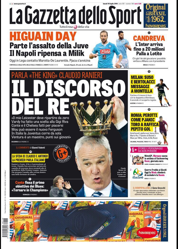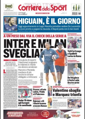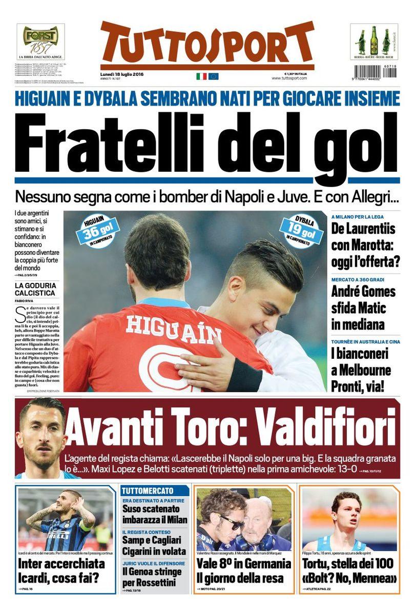 Le prime pagine dei quotidiani sportivi in edicola oggi sono tutte incentrate su un argomento in particolare: la trattativa tra Juventus e Napoli per Gonzalo Higuain. Sia La Gazzetta dello Sport che il Corriere dello Sport, infatti, hanno soprannominato questo lunedì di luglio come l'”Higuain Day”; nella giornata di oggi ci sarà un’assemblea in Lega e potrebbe essere l’occasione per azzurri e bianconeri di abbozzare una trattativa per il Pipita. La Rosea individua come sostituto del giocatore argentino l’attaccante dell’Ajax Milik, mentre il CDS insiste nel puntare su Mauro Icardi. Tuttosport titola, invece, “Fratelli del gol” riferito proprio ad Higuain e a Dybala che a Torino potrebbero formare una coppia offensiva da paura; il quotidiani torinese riporta anche della forte avanzata dei granata di Urbano Cairo per il centrocampista del Napoli Mirko Valdifiori.