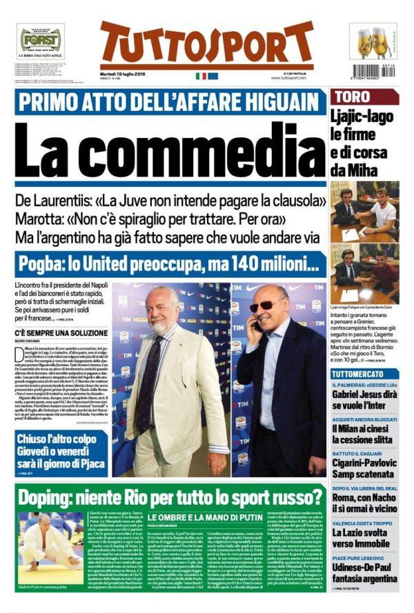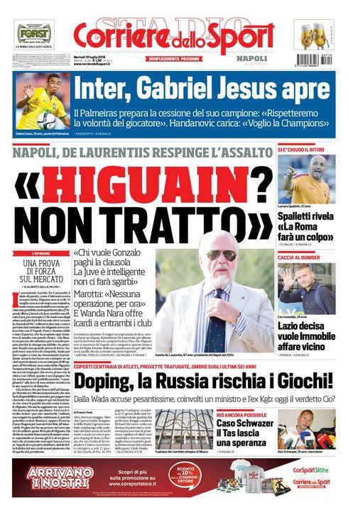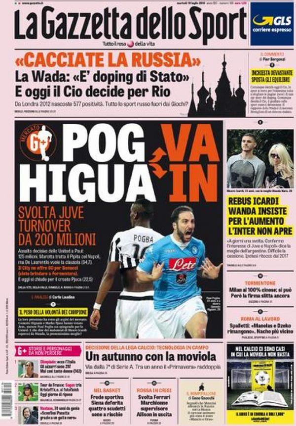 Sulle prime pagine dei quotidiani sportivi nazionali in edicola quest’oggi l’argomento centrale non può che essere Gonzalo Higuain e l’incontro avvenuto in Lega tra De Laurentiis e Marotta. Il Napoli ha detto “no” alla Juventus, ma la trattativa potrebbe non essere chiusa e così il Corriere dello Sport rivela i vari retroscena legati all’affare Pipita e intanto Wanda Nara offre Mauro Icardi ad entrambe le squadre. Tuttosport definisce, invece, “commedia” il rapido incontro e il discorso abbozzato dal patron partenopeo e il dirigente bianconero; anche il quotidiano torinese, però, non chiude definitivamente la trattativa dato che alla Juventus sarebbe pervenuta un’offerta del Manchester United per Paul Pogba di 140 milioni, soldi che sarebbero poi reinvestiti su Higuain. La Gazzetta dello Sport segue la linea degli altri due quotidiani lasciando aperti tutti gli scenari riguardanti l’attaccante argentino; le cessioni di giocatori come Pogba e Bonucci vengono definite come “turnover da 200 milioni” che consentirebbero di arrivare al Pipita.