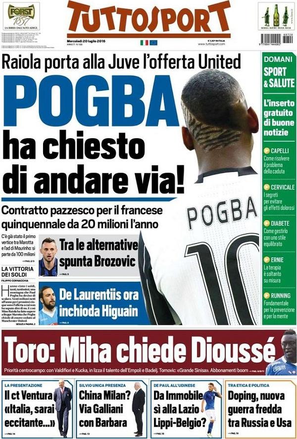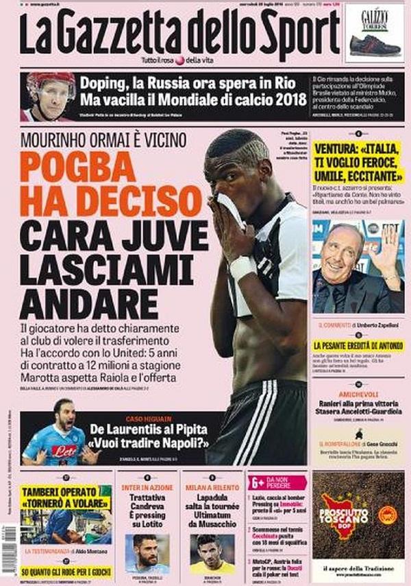 Come era prevedibile, le principali testate sportive nazionali si concentrano principalmente su due temi: la possibile cessione di Pogba al Manchester United e le dichiarazioni di De Laurentiis riguardo la trattativa Higuain-Juve. La prima pagina del Corriere dello Sport, ad esempio, titola con certezza: “Pogba torna a Manchester per 125 milioni!”; all’incirca sulla stessa scia sono anche La Gazzetta dello Sport, che oltre al capitolo Pogba dedica un trafiletto al Pipita circa de parole di patron De Laurentiis: “De Laurentiis al Pipita: <<Vuoi tradire Napoli?>>” e Tuttosport, con “Pogba ha chiesto di andare via!” e “De Laurentiis ora inchioda Higuain“.