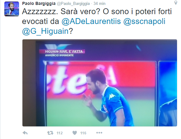 Uno su tutti, Paolo Bargiggia, giornalista di Mediaset Premium, che proprio a marzo parlò del futuro del Pipita lontano da Napoli, scatenando la reazione del club partenopeo. Ovviamente, dopo la notizia bomba arrivata sulle visite mediche svolte da Gonzalo Higuain a Madrid per la Juventus, il noto giornalista non ha perso tempo e si è fatto sentire tramite il proprio profilo Twitter con una serie di “cinguettii”.