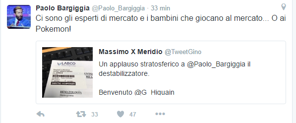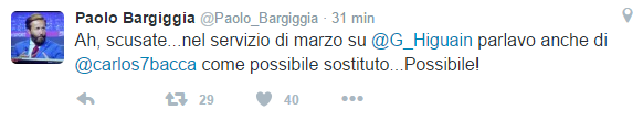 Questi i suoi messaggi: “Sarà vero o saranno i poteri forti evocati da De Laurentiis?”, “ci sono gli esperti di mercato e i bambini che giocano al mercato… o ai pokemon”, “ah, scusate, nel servizio di marzo su Higuain parlavo anche di Bacca come possibile sostituto…. possibile!”.