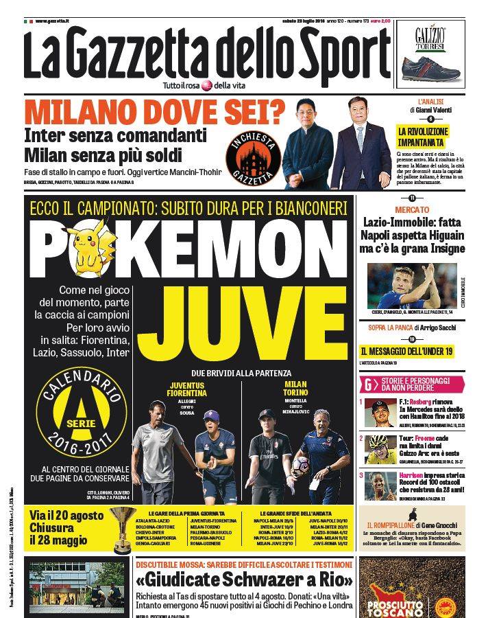 Un’altra giornata di sport ha inizio: sono uscite infatti le prime pagine dei quotidiani sportivi in edicola domattina. Ampio spazio alla formazione dei calendari della prossima Serie A. Non manca il mercato e soprattutto il Napoli: sul Corriere dello Sport spazio alla suggestione Carlos Bacca in caso di partenza di Gonzalo Higuain. Tuttosport, invece, paventa l’ipotesi di uno sconto di circa 5 milioni nell’affare Higuain alla Juventus. Infine la Gazzetta pone l’attenzione sulla “grana Insigne”, visti gli intoppi sul rinnovo dell’attaccante azzurro.