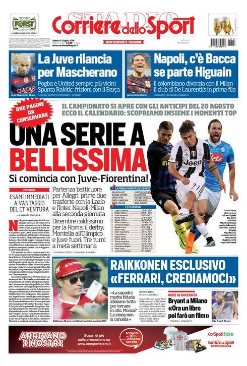 Un’altra giornata di sport ha inizio: sono uscite infatti le prime pagine dei quotidiani sportivi in edicola domattina. Ampio spazio alla formazione dei calendari della prossima Serie A. Non manca il mercato e soprattutto il Napoli: sul Corriere dello Sport spazio alla suggestione Carlos Bacca in caso di partenza di Gonzalo Higuain. Tuttosport, invece, paventa l’ipotesi di uno sconto di circa 5 milioni nell’affare Higuain alla Juventus. Infine la Gazzetta pone l’attenzione sulla “grana Insigne”, visti gli intoppi sul rinnovo dell’attaccante azzurro.