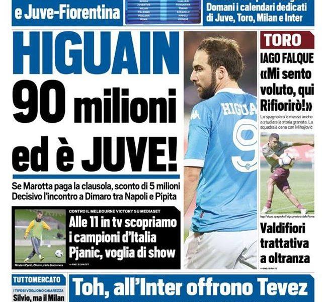 PHOTOGALLERY – Sconto Juve per Higuain e “grana Insigne”: ecco le prime pagine dei quotidiani sportivi