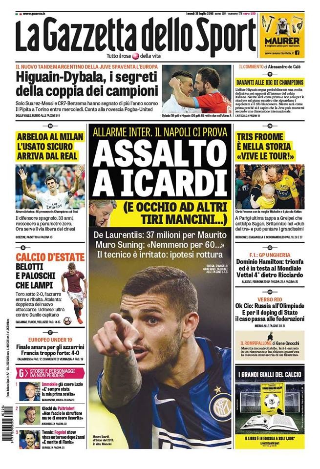 “Assalto a Icardi”: apre così l’edizione della Gazzetta dello Sport. Il Napoli avrebbe individuato nel 9 dell’Inter il perfetto erede di Higuain.