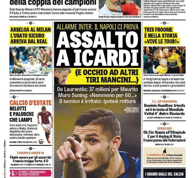 Un’altra giornata di sport ha inizio: sono uscite infatti le prime pagine dei quotidiani sportivi in edicola da domattina. Tema caldo la trattativa tra il Napoli e l’Inter per Mauro Icardi, con la Gazzetta che dedica ampio spazio all’interesse degli azzurri per la sua punta di diamante. Tuttosport paventa l’ipotesi di vedere Witsel in maglia bianconera e dedica spazio in secondo piano all’affare Valdifiori-Torino e all’interesse azzurro per Icardi. Sul Corriere dello Sport prima pagina dedicata quasi interamente a Mancini e ai suoi malumori.