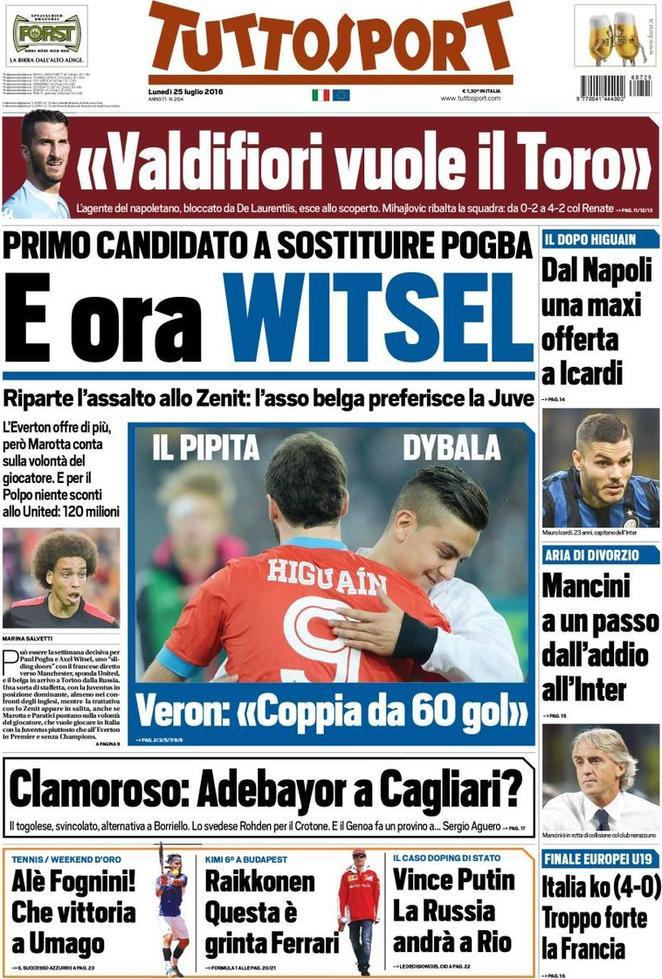 E’ Witsel il prescelto per la mediana della Juventus: Marotta e Paratici vogliono regalare ad Allegri una squadra in grado di vincere la Champions. In taglio alto spazio alla trattativa Valdifiori-Toro, mentre in secondo piano menzione per l’offerta del Napoli all’Inter per Icardi