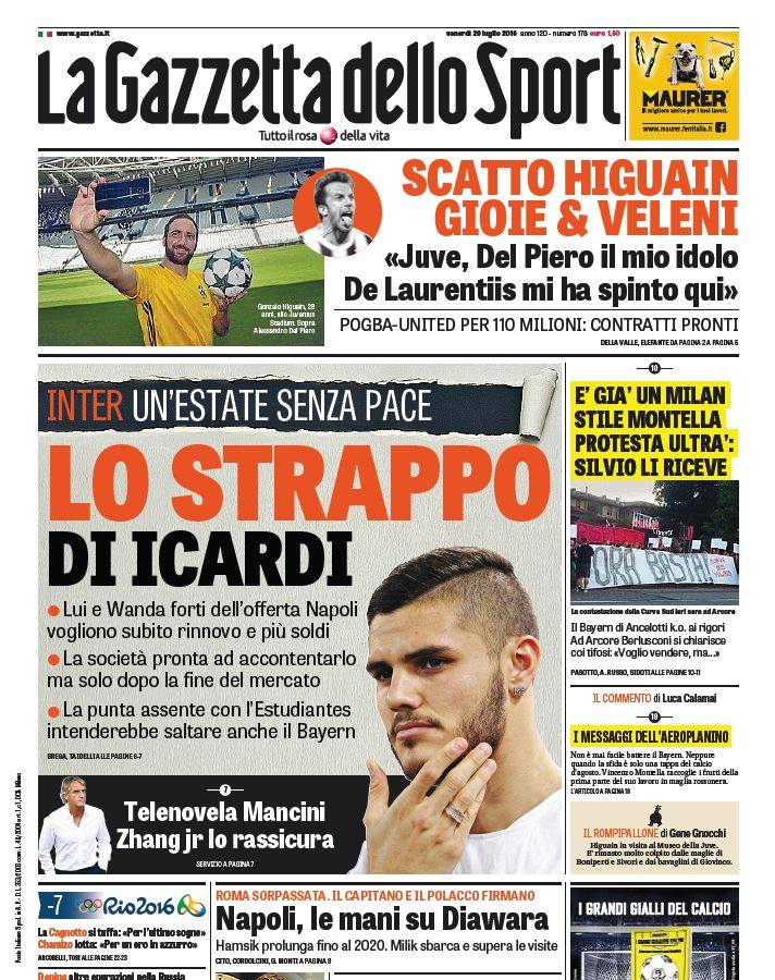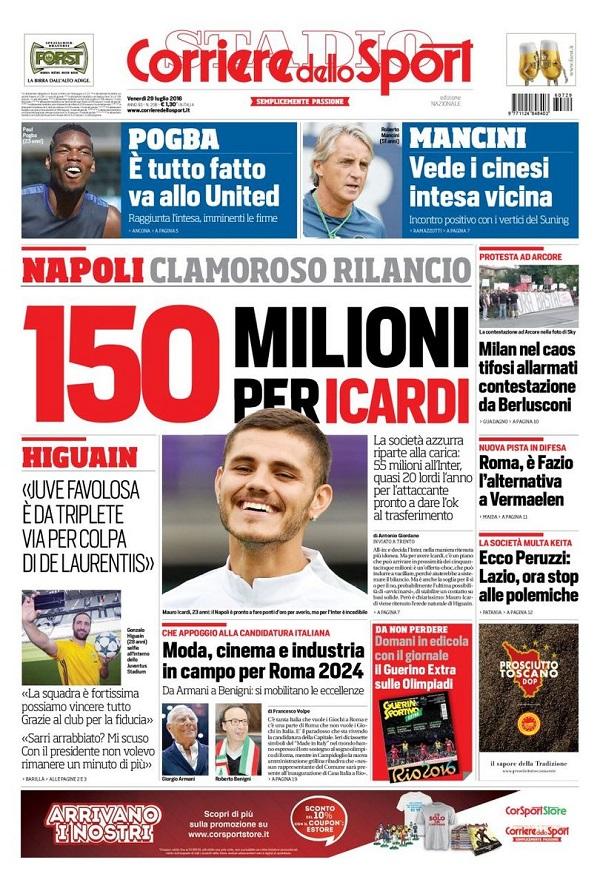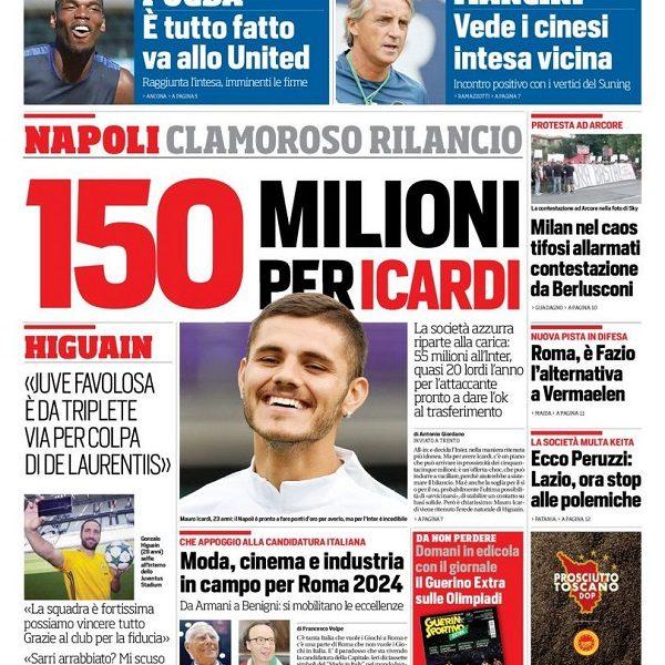 Ha del clamoroso però la prima pagina del Corriere: il Napoli sarebbe infatti intenzionato a spendere 150 milioni per Icardi, tra costo del cartellino (55) e ingaggio (20 lordi all’anno). L’attaccante, dal canto suo, sarebbe pronto a dire sì agli azzurri.