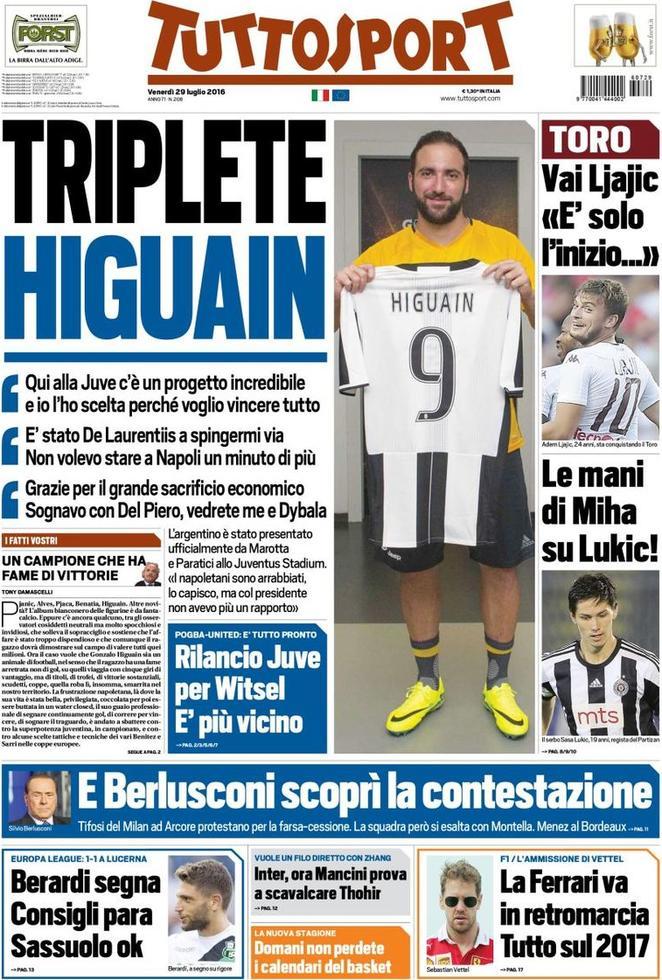 Ampio spazio su Tuttosport alle dichiarazioni di Higuain, in particolar modo alle ambizioni sbandierate dal Pipita (“Triplete”) e alle bordate ad Aurelio De Laurentiis