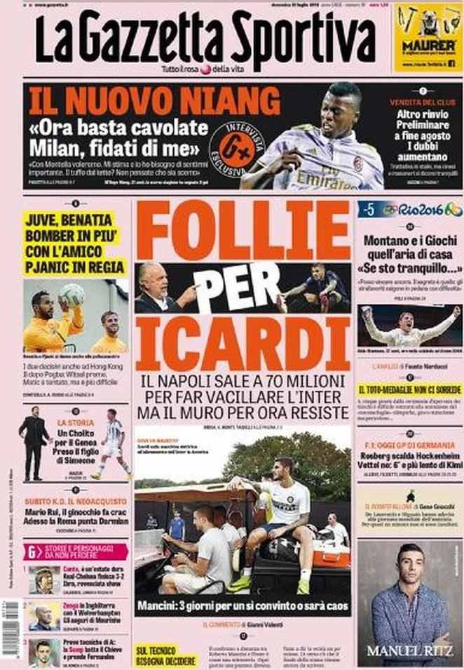 “Follie per Icardi: il Napoli sale a 70 milioni per far vacillare l’Inter, ma il muro per ora resiste”, apre così in prima pagina la Gazzetta dello Sport. “Strappo Icardi – titola il Corriere dello Sport – Wanda lo spinge a non giocare, il Napoli è arrivato a 60 milioni”.