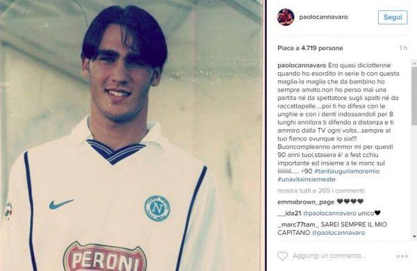 Oggi la Ssc Napoli compie ben 90 anni. Tanti personaggi illustri che hanno fatto parte della società in passato hanno voluto lanciare un messaggio di auguri. Uno dei più intensi è stato, senza dubbi, quello di Paolo Cannavaro. L’ex capitano azzurro, ora in forza al Sassuolo, ha postato una foto su Twitter che lo ritrae con la maglia del Napoli nel giorno del suo esordio in serie B.