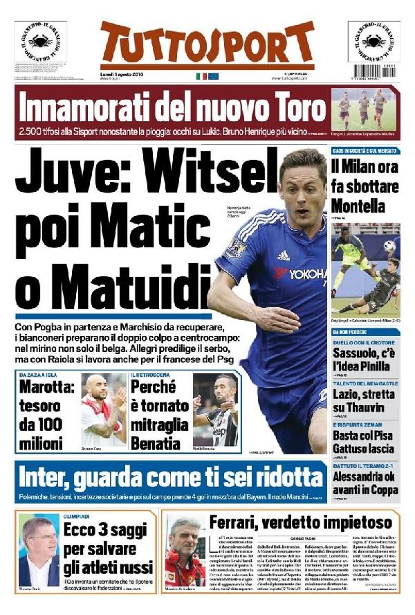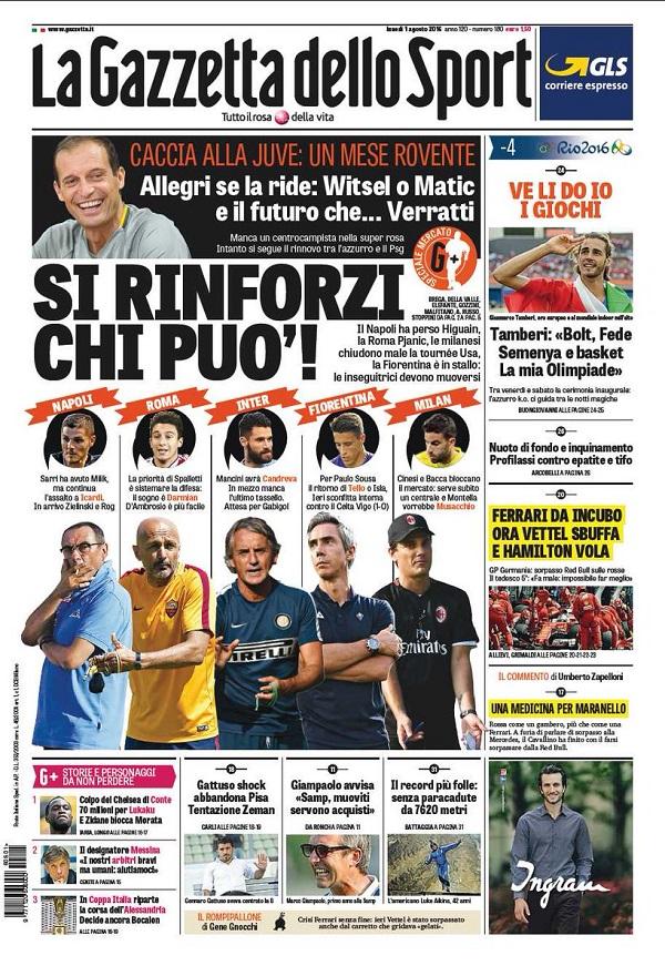 Sulla Gazzetta dello Sport troviamo un’analisi del mercato di tutte le big della Serie A, mentre su Tuttosport in primo piano c’è la Juventus che punta un centrocampista per sostituire il partente Pogba (SCORRI IN ALTO LE PRIME PAGINE DEI QUOTIDIANI SPORTIVI).