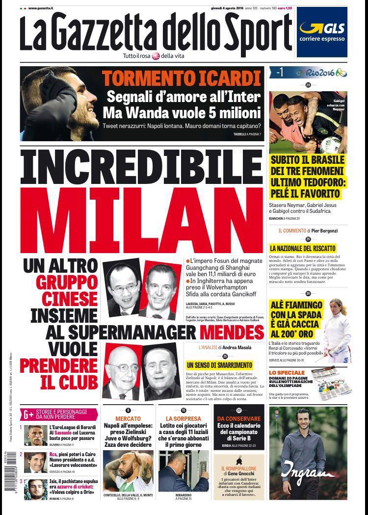 Per quanto concerne La Gazzetta dello Sport in prima pagina c’è la trattativa societaria del Milan, con una nuova cordata cinese pronta a fare un’offerta per rilevare il club rossonero. A fondo pagina si parla anche del Napoli, con gli azzurri che puntano Zaza per il futuro.