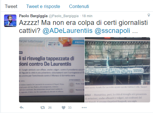 E proprio della contestazione dei tifosi azzurri ha parlato anche l’esperto di mercato di Mediaset Premium, Paolo Bargiggia. Il giornalista, nei mesi scorsi bersaglio di insulti da parte dei tifosi del Napoli viste le sue indiscrezioni che vedevano Gonzalo Higuain lontano da Napoli, ha pubblicato sul proprio profilo Twitter le foto dei vari striscioni, accompagnando il tutto con una frase: “Ma non era colpa di certi giornalisti cattivi?”.