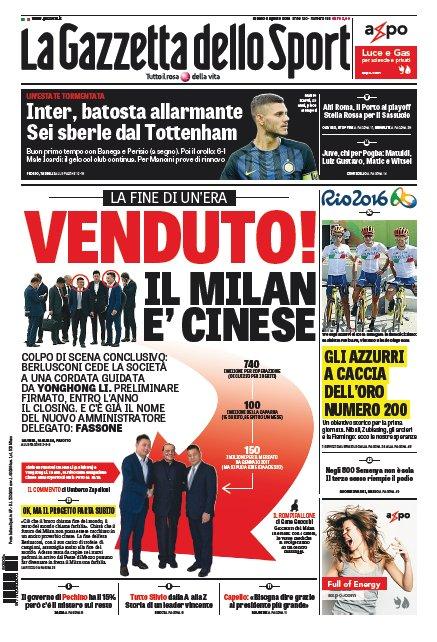 Sono stato pubblicate online le principali prime pagine dei quotidiani sportivi nazionali, inizia la Gazzetta dello Sport che titola con un grande scritta rossa: “VENDUTO!“. Si può ritrovare infatti all’interno un’ampia trattazione sulla cessione dell’AC Milan ad una cordata cinese capeggiata da Yonghong Li.
