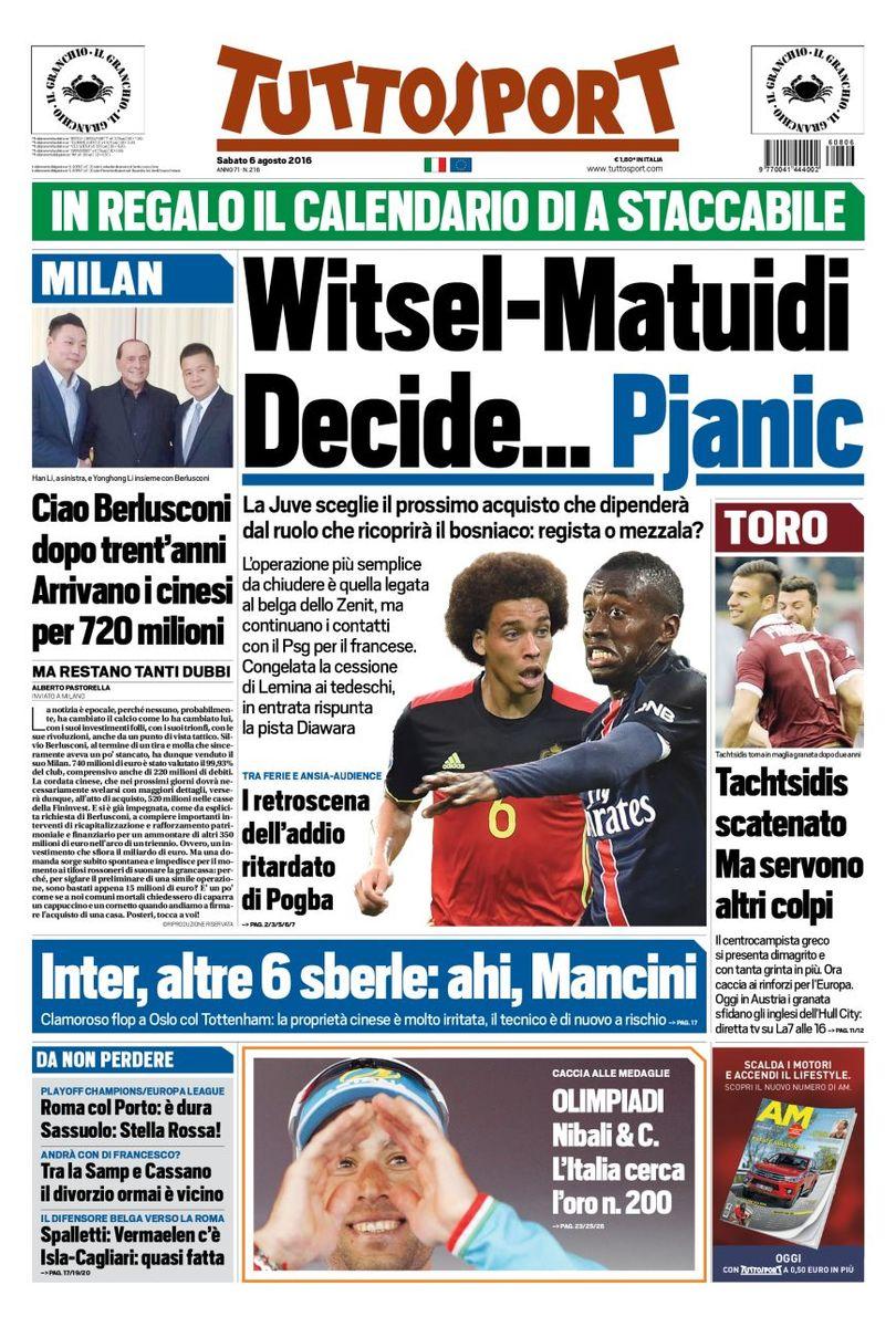 Chiudiamo con Tuttosport che invece si concentra sul mercato juventino riportando in prima pagina quelli che sono i due presunti prossimi obiettivi del club torinese ovvero Axel Witsel e Blaise Matuidi: “Witsel-Matuidi decide… Pjanic”