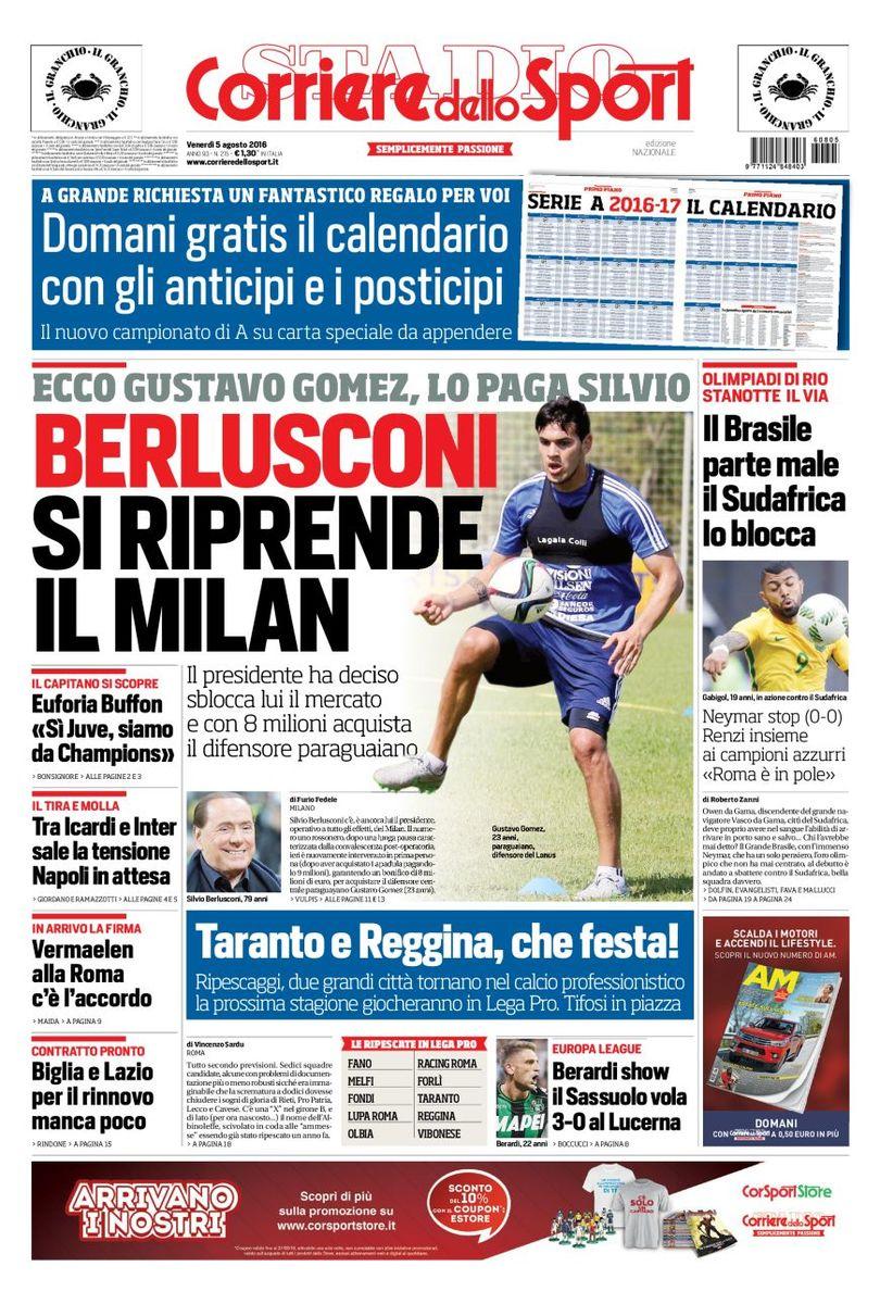 Passiamo poi al Corriere dello Sport che titola con: “Berlusconi si riprende il Milan“. Dopo la cessione alla cordata cinese il giornale capitolino porta il focus sul mercato del Milan e sul “regalo” che Berlusconi avrebbe fatto prima di lasciare il club acquistando Gustavo Gomez.